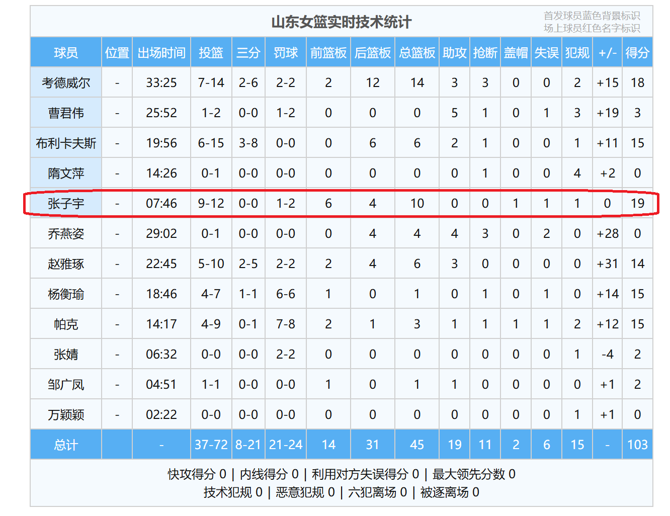 全场比赛,2米26的张子宇,一共打了7分46秒,第一节比赛,打了4分06秒,投篮5中5,砍下了10分4篮板。第二节比赛、第三节比赛,张子宇都是没有打。到了末节比赛,张子宇再一次登场,打了3分钟40秒,投篮7中4,交出了9分6篮板,就这样,张子宇轻松交出了19分10篮板1盖帽的两双数据。(10个篮板球当中,其中,有6个是进攻篮板球。)